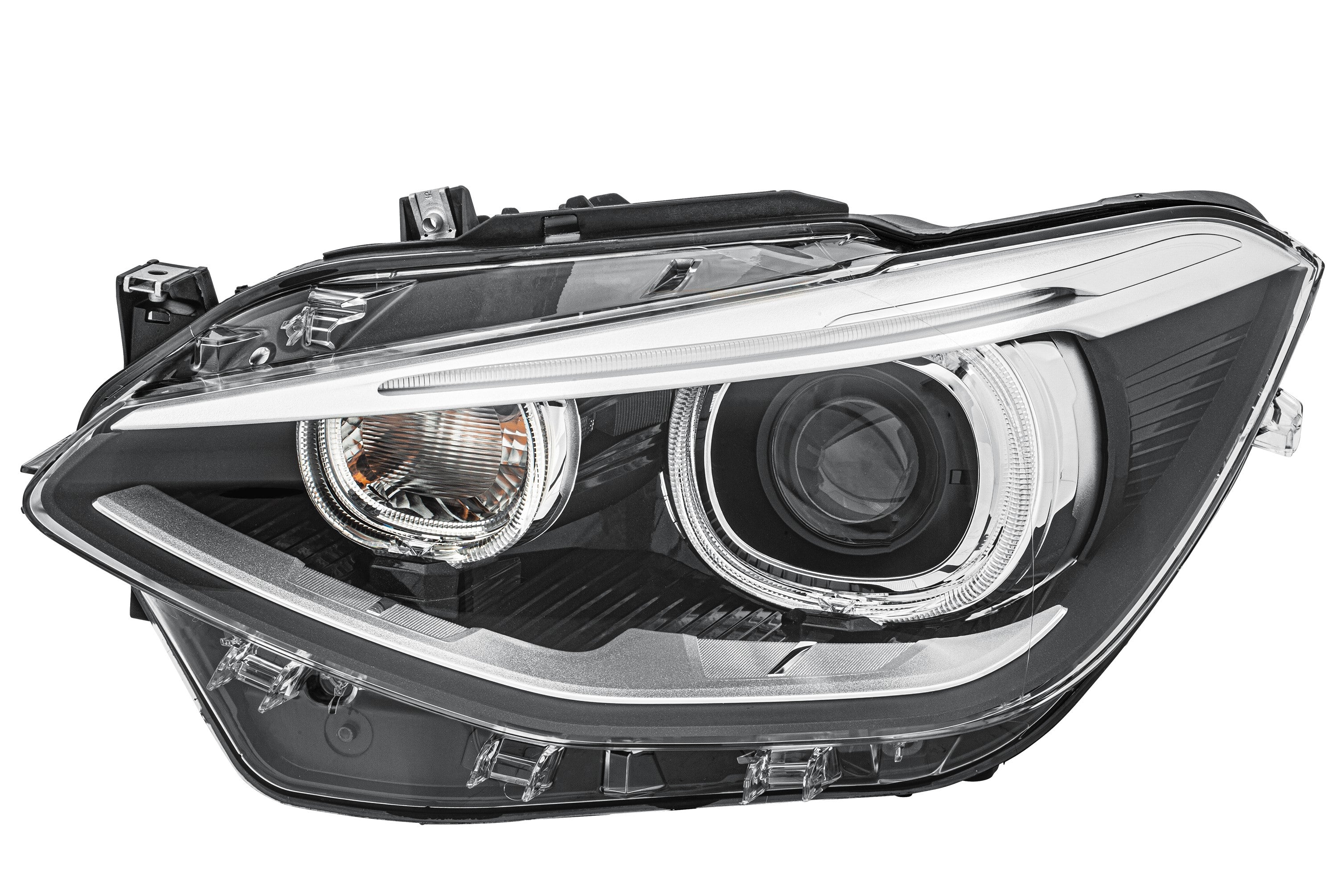 This OEM Hella Left headlight (Bi-Xenon with LED DRL) is factory-fitted on BMW 1 Series F20 (5-door) and F21 (3-door) models with Xenon headlights (non-adaptive). Direct replacement for Hella 1LL010741571 and BMW OE 63117229687, 63117296911. Also called headlamp, xenon headlight, bi-xenon headlamp, front light, LED DRL light.